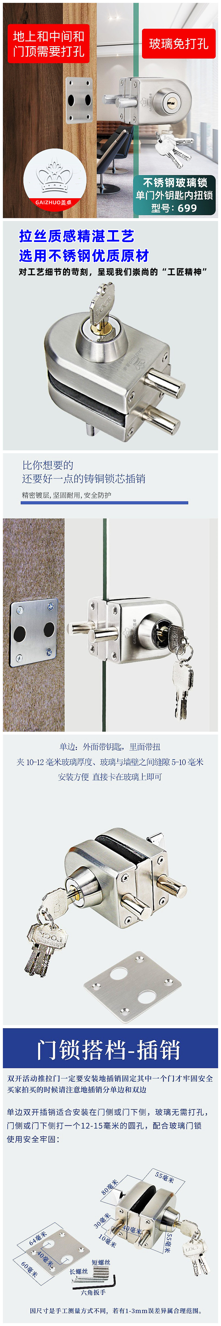 玻璃门地锁地插销免开孔浴室锁